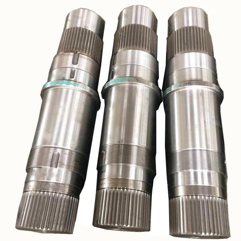棒料、鍛件 → 粗車加工 → 調質 → 精車加工 → 銑鍵槽 → 熱處理(表面淬火貨滲碳淬火) → 研磨中心孔 → 粗磨 → 精磨 → 成品檢測包裝